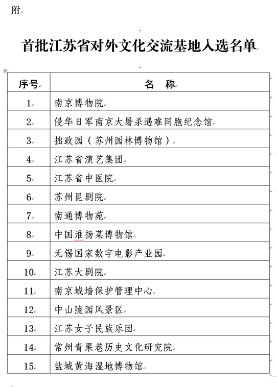 江苏发布《关于首批江苏省对外文化交流基地评选结果的公示》,《公示》显示,南京博物院、侵华日军南京大屠杀遇难同胞纪念馆、拙政园(苏州园林博物馆)等15地入选首批江苏省对外文化交流基地名单。