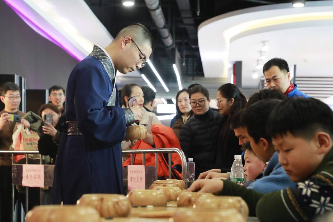大年初二,围棋世界冠军芈昱廷在家乡徐州的城市中心商圈金地商都,受邀参加新春公益指导棋活动,给围棋爱好者带来了一场围棋视觉盛宴,场面十分热烈,据了解报名参加活动的棋迷还有从南京赶过来的。 围棋联谊会 二月十一号由市文产专家委员会、市电影协会主办的“与世界冠军面对面”活动中,徐州籍围棋九段国手芈昱廷应邀参加了新春“多面打”围棋联谊会,以一对九与围棋爱好者切磋棋艺。提前报名并幸运抽中的九位业余棋手中,有小学二年级的业余三段小朋友,也有24岁的业余五段大小伙。 当天的活动,有专程跟着父母从南京赶来的小朋友,也有替在国外留学的业余五段儿子追星求签名的妈妈。围棋活动结束后,芈昱廷接受采访时表示:“徐州围棋氛围很好,棋手们的学习积极性很高,很高兴有这样的机会与大家交流,宣传中国的围棋文化。” 替儿子追星、求得围棋九段芈昱廷签名的妈妈和芈昱廷的合影。 在中心商区举行的“影院+”活动中,还开展了鼓楼区刺绣、玉雕、木版水印制作等非遗项目展示展销、汉服布艺制作体验等活动,在顺应群众节日生活多样化、个性化需求的同时,弘扬中华优秀传统文化,为市民留下一个不同凡响的春节记忆。(张瑾 秦媛)